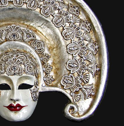 当店のマスクは、イタリアの工房で一点一点職人達によって作られた本物です。大量生産ではなく伝統の技による匠達の手作りのため仮面の一つ一つに若干の個性があり、装飾の位置、色使い、色目、生地の柄、 石の色、柄表情などが、実物と写真とは微妙に異なる場合がございますので予めご了承くださいませ。写真は見本になります。